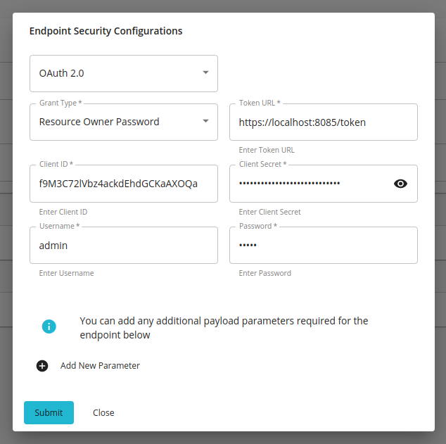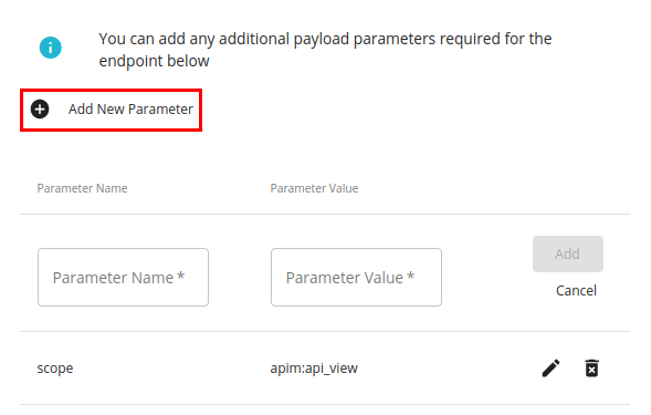 If the OAuth-2.0-protected backend server token endpoint requires any other properties to be passed in addition to the above, click Add Parameter and provide the required properties and their respective values.